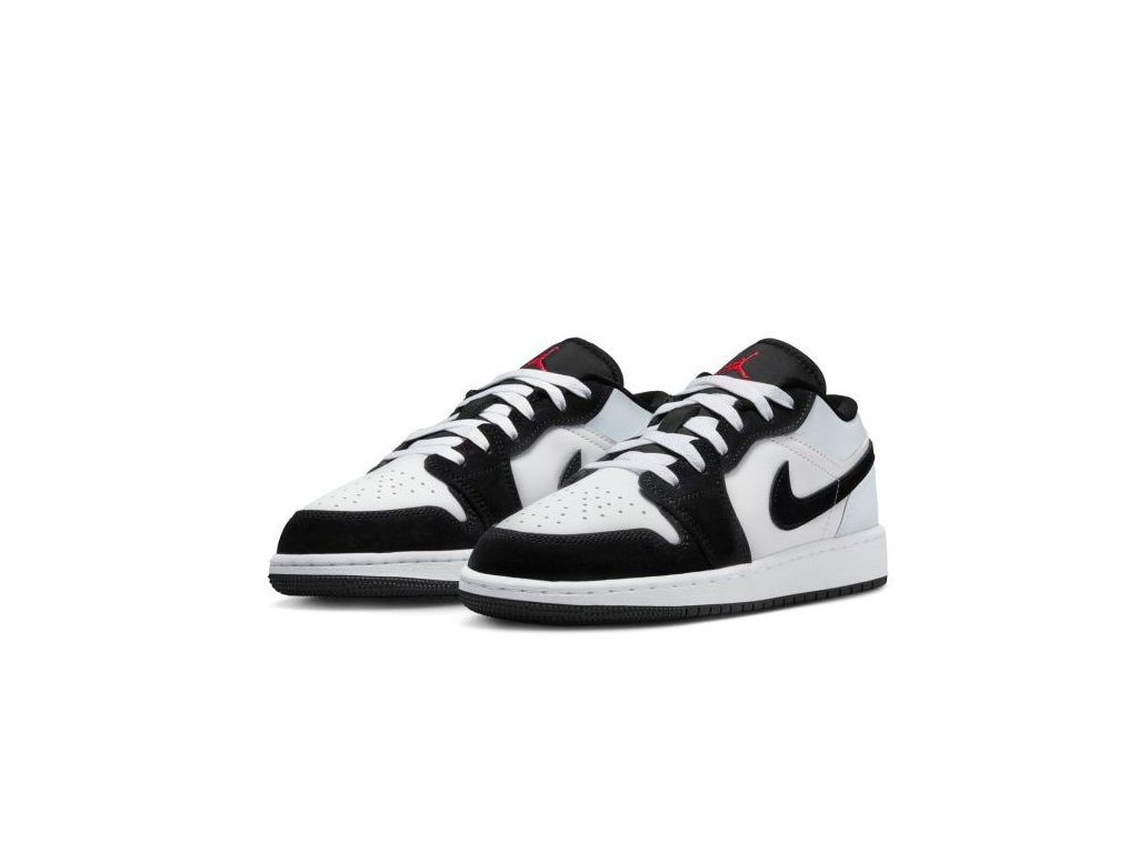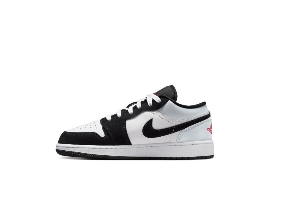 Jordan 1 Low SE "Panda Toe" (GS) mají svršek z hladké bílo - černé kůže v kombinaci se stříbrným překryvem na patě. Design dotváří černé Nike Swoosh Logo a tradiční červené Wings logo vyšité na patě. Červený tkaný štítek na jazyku Jumpman dodává konečnou podobu.