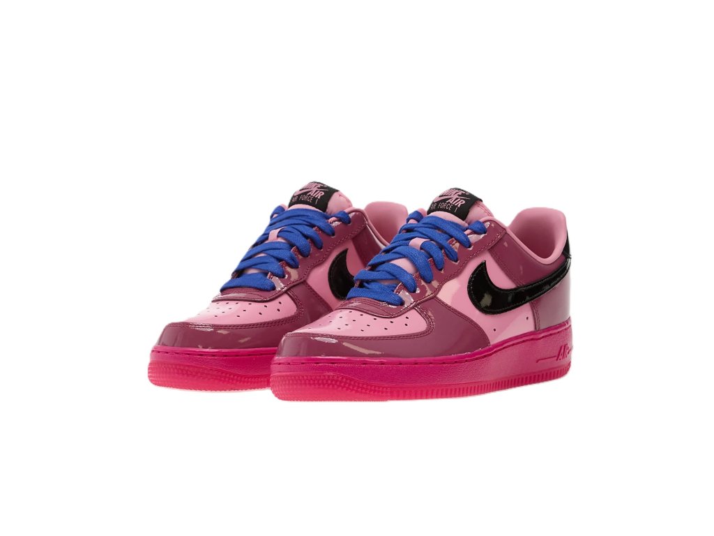 Nike Air Force 1 Low "Pink Cooler Mulberry Rose" jsou výrazné tenisky se svrškem, který je složen z kožených a lakovaných panelů v různých odstínech růžové barvy. Design doplňuje černé Nike Swoosh a sytě modré tkaničky.