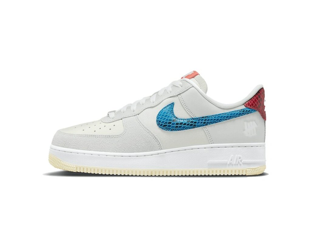 Nike Air Force 1 Low SP "Undefeated 5 On It Dunk vs. AF1" vznikly ve spolupráci Nike a Undefeated. Název 5 On It značí, že jsou tenisky vyrobeny z pěti různých materiálů, kdy na tenisce vidíme kůži, semiš, plátno, nubuk a "hadí" kůži v šedé, béžové, modré a červené barvě. Design dotváří právě modré Swoosh logo na boku tenisky.