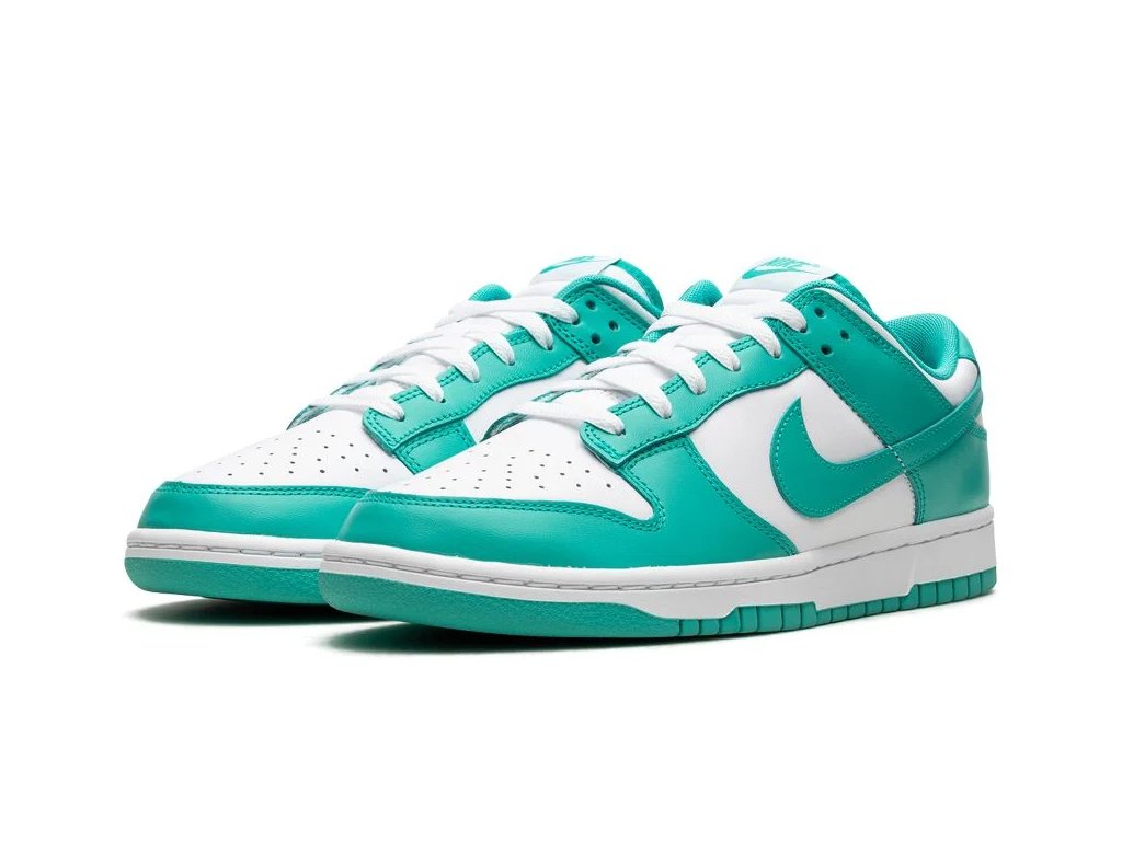 Nike Dunk Low "Clear Jade" byly vydány v létě 2023. Tenisky mají kožený svršek v kombinaci bílé a tyrkysové barvy, doplněný o Nike Swoosh logo a bílé tkaničky. Tyrkysovo - bílá podrážka dodává teniskám správný styl.