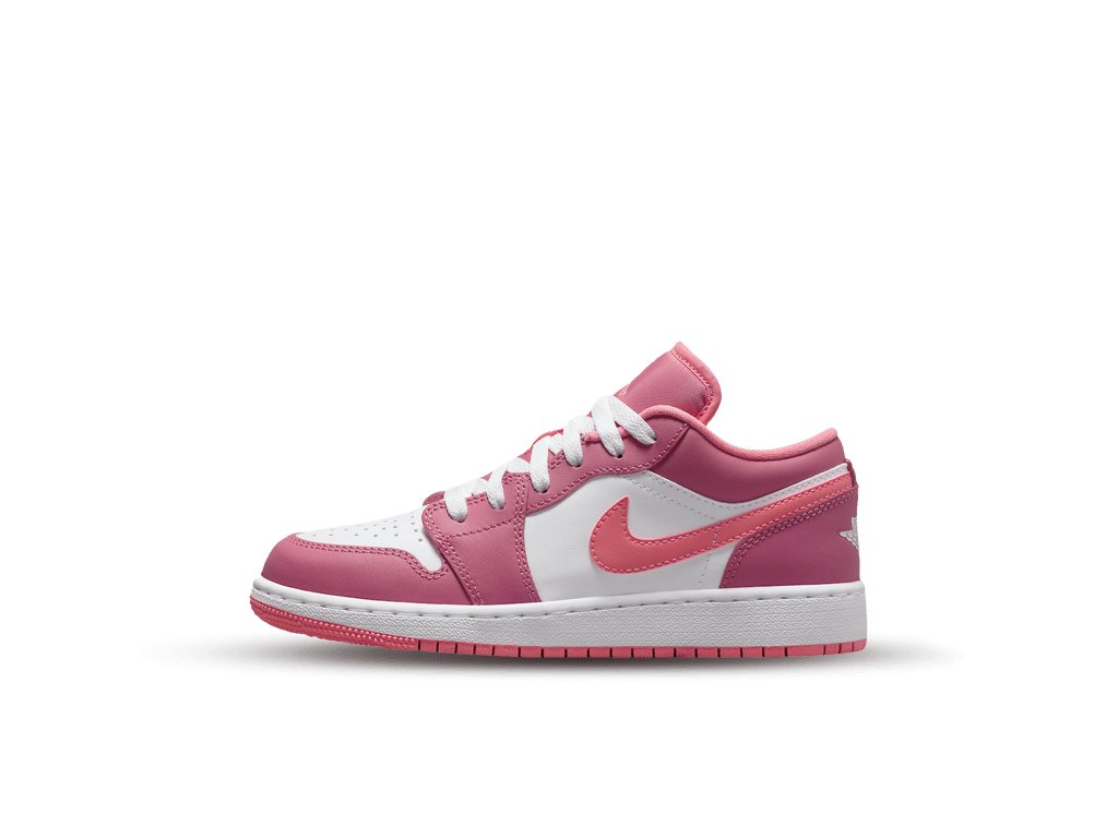 Air Jordan 1 Low "Desert Berry" (GS) mají svršek z hladké bílé kůže s růžovými barevnými překryvy, design dotváří oranžové Nike Swoosh Logo a tradiční Jordan 1 Logo vyšité na patě. Tkaný štítek na jazyku Jumpman a růžová podrážka dodávají konečnou podobu.