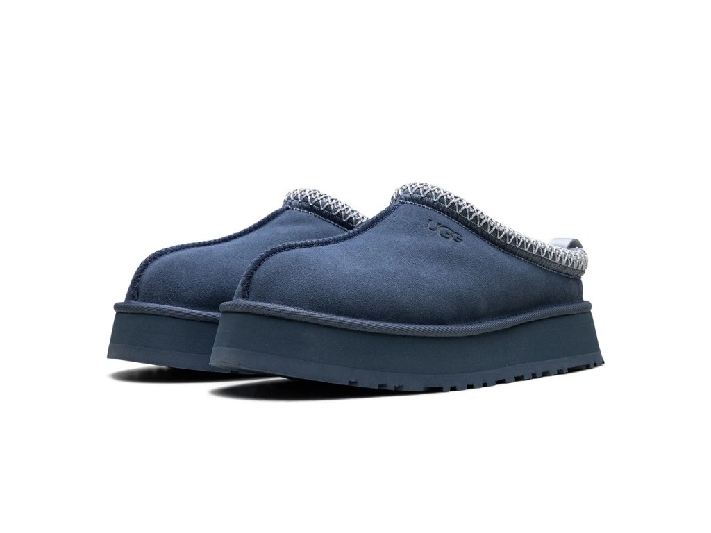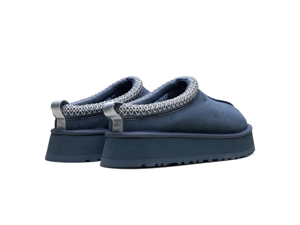 Tento model UGG má siluetu pantoflí UGG s platformovou podrážkou Sugarcane EVA, která je udržitelná, o výšce 1,5 palce pro dodatečné tlumení. Je vyroben ze semišového svršku v kombinaci s kůží v modré barvě. Je také vyložený UGGplush — směs vlny a TENCEL/lyocellu pro pocit měkkosti a vysokého pohodlí.