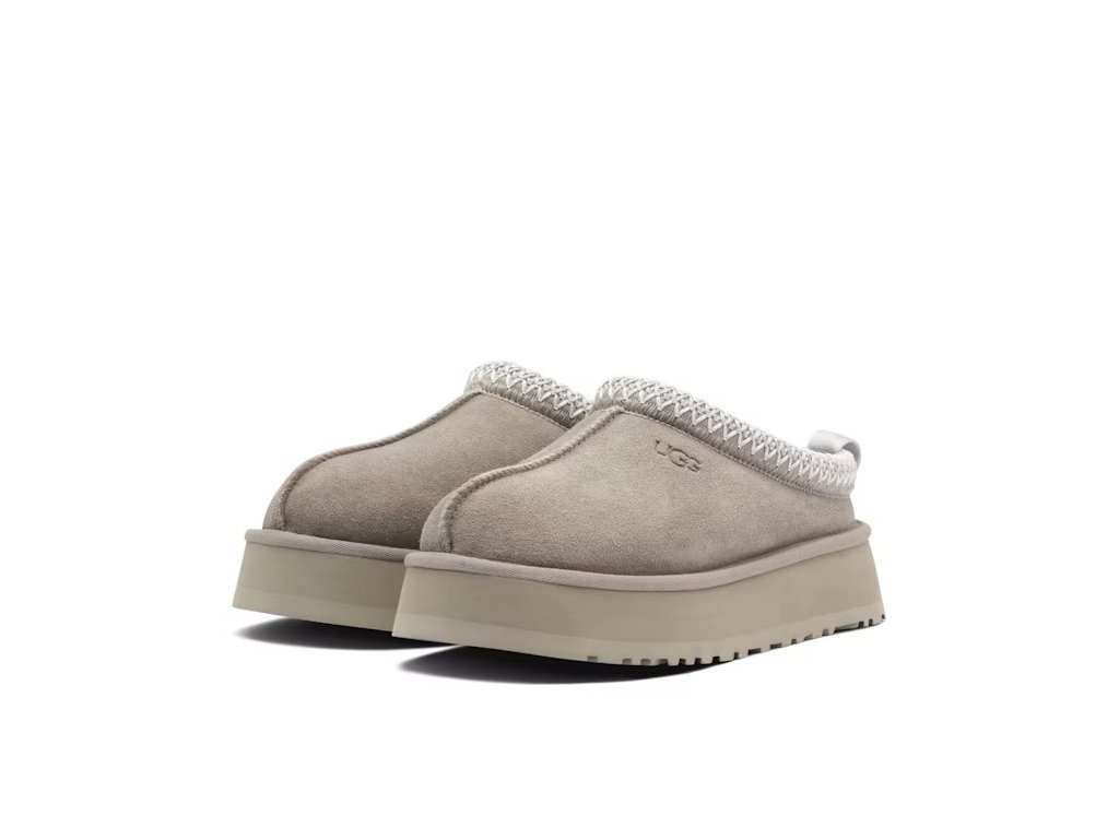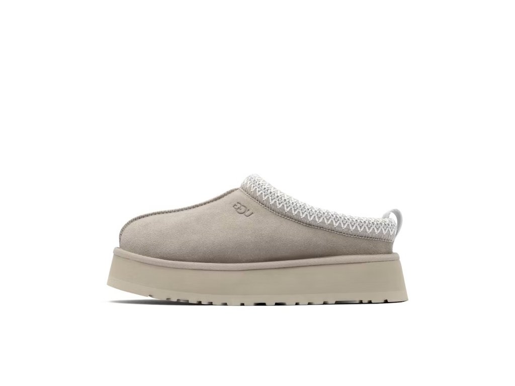 Tento model UGG má siluetu pantoflí UGG s platformovou podrážkou o výšce 1,5 palce pro dodatečné tlumení. Je vyroben z toho samého semišového svršku ve světle šedé barvě. Je také vyložený charakteristickou směsí vlny UGG pro pocit pantoflí. Jeho textilní lemování je vyrobeno z materiálu z 100% recyklovaných polyesterových vláken.