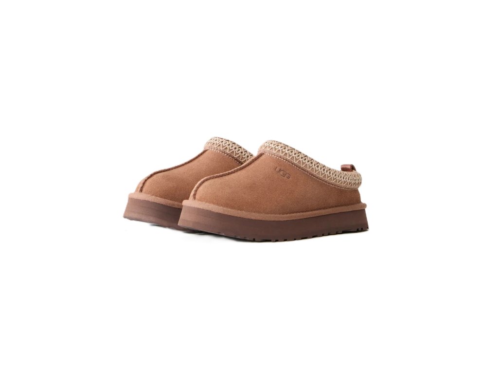 Tento model UGG má siluetu pantoflí UGG s platformovou podrážkou o výšce 1,5 palce pro dodatečné tlumení. Je vyroben z toho samého semišového svršku v hnědé barvě. Je také vyložený charakteristickou směsí vlny UGG pro pocit pantoflí. Jeho textilní lemování je vyrobeno z materiálu z 100% recyklovaných polyesterových vláken.